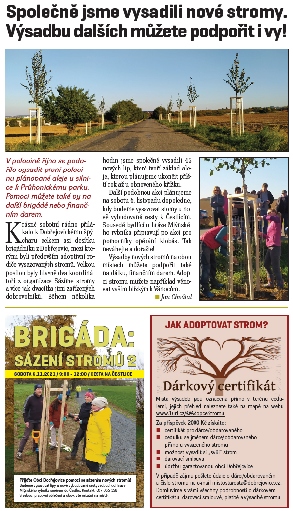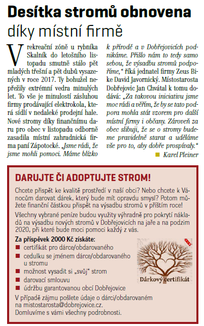 CertifikátVšechny darované peníze  byly využity výhradně pro pokrytí nákladů na výsadbu nových stromů v Dobřejovicích. Sázení proběhlo za účasti občanů naší obce.
