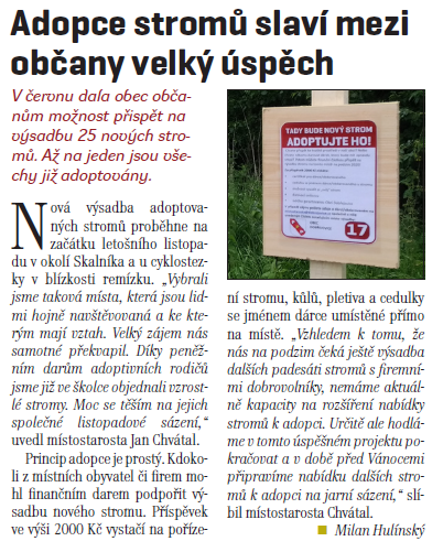 Aktuální informace: Máme radost, že má tento náš projekt úspěch. Aktuálně již obec nedisponuje žádnými vhodnými pozemky, kde by byla výsadba nových stromů možná.