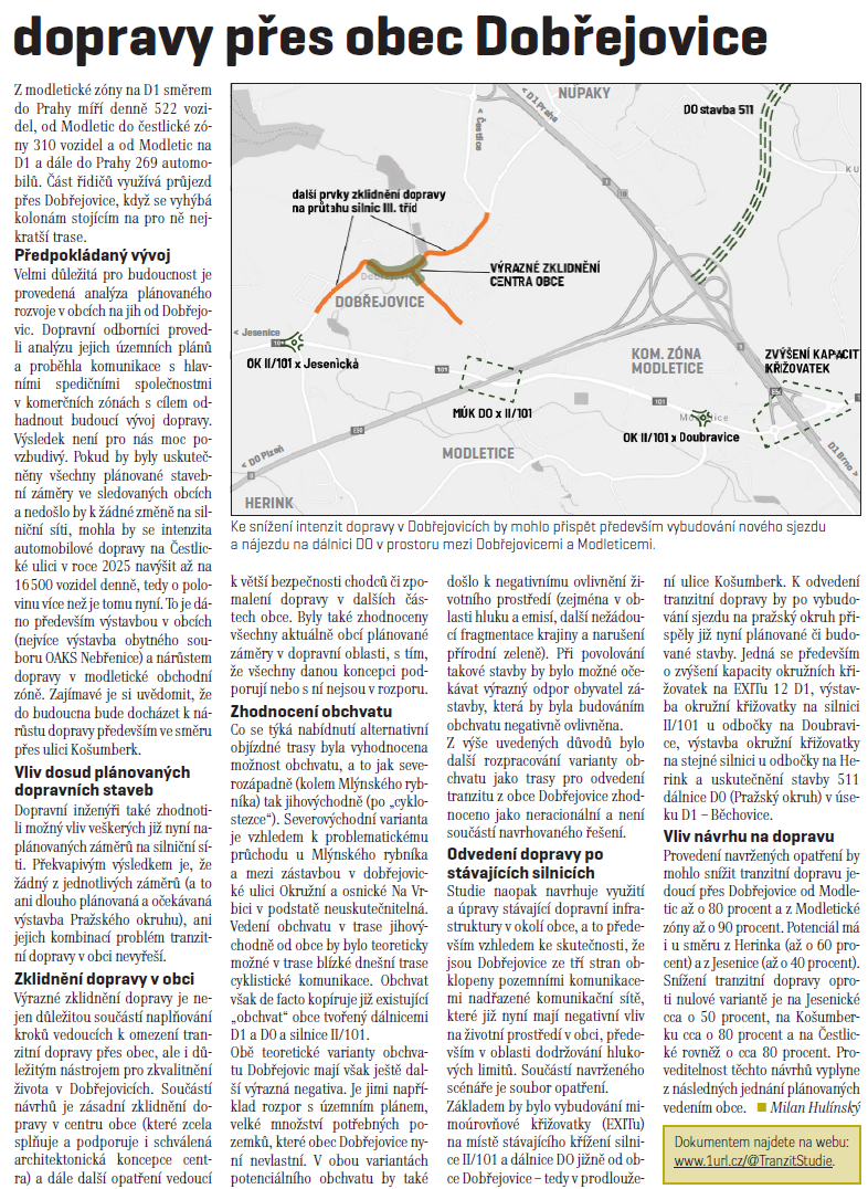 Mohou to být například úpravy křižovatek či nové sjezdy. Zhodnocena bude i možnost obchvatu. U každého opatření bude uveden jeho odhadovaný vliv na objem tranzitní dopravy v obci a identifikace případných rizik. Ve finále dopravní inženýři doporučí obci prosazovat takový soubor opatření, které budou mít největší potenciál k omezení tranzitní dopravy.