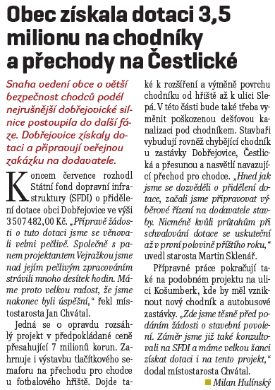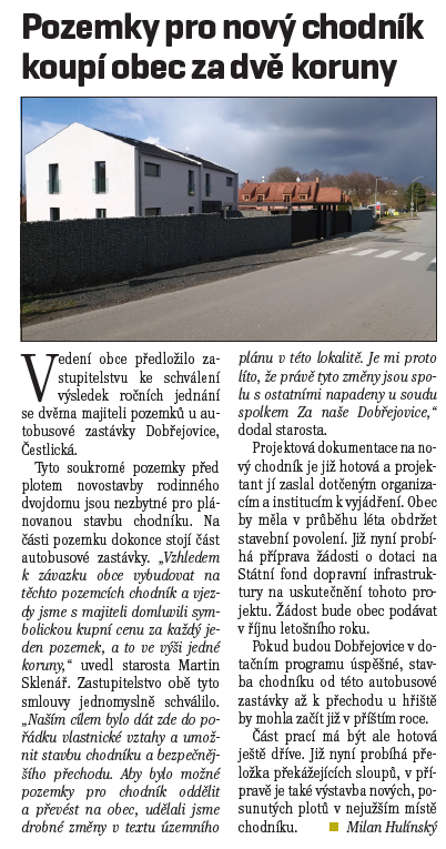 Cílem je dosahnout rozšíření chodníku, nyní v některých místech širokého pouze 60 cm, na nejužším a nejfekventovanějším místě průtahu Dobřejovicemi. Součástí projektu je směna či nákup pozemků, výstavba nových plotů, přesun sloupů elektrického vedení (vedeno jako samostatný projekt), oprava dešťové kanalizace, výstavba chodníku a dopravní značení.
