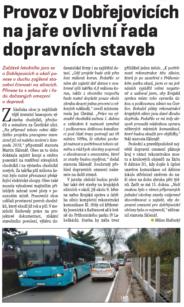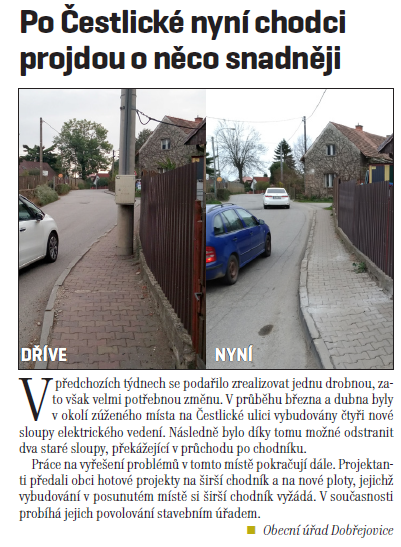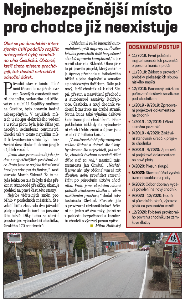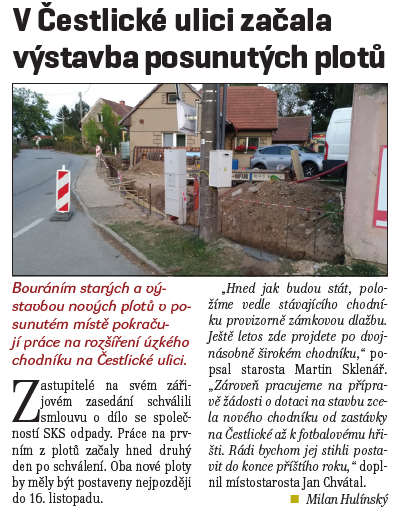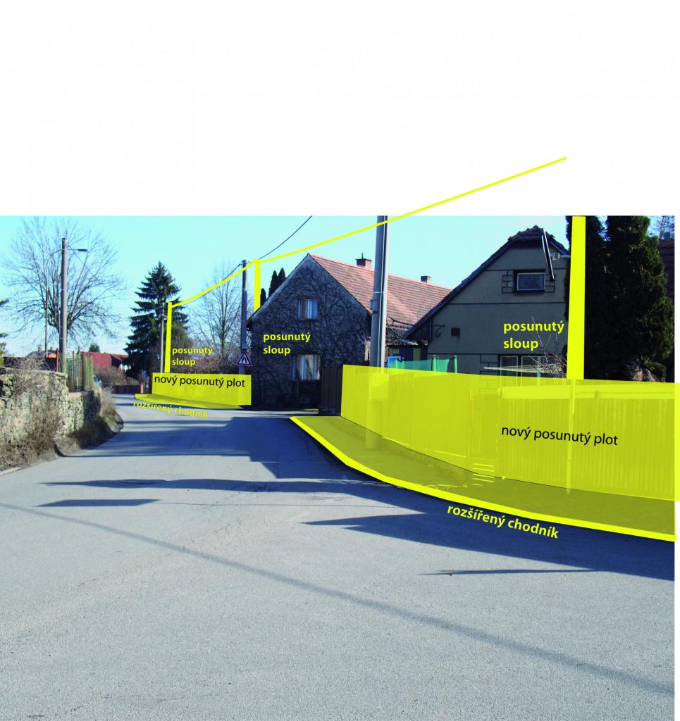 Stav duben 2021: byly vystavěny oba ploty v posunutém místě, na konci roku 2020 byl vlastními silami obce provizorně rozšířen chodník. Byla podání žádost o dotaci na SFDI, která byla úspěšná.