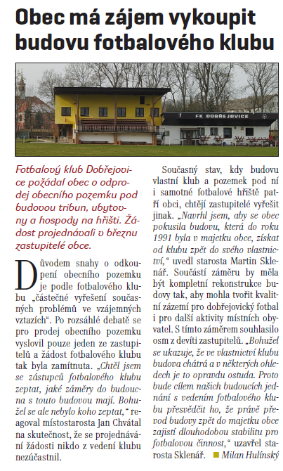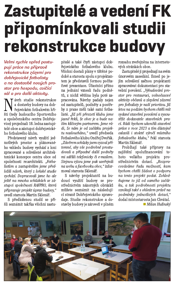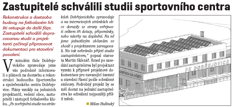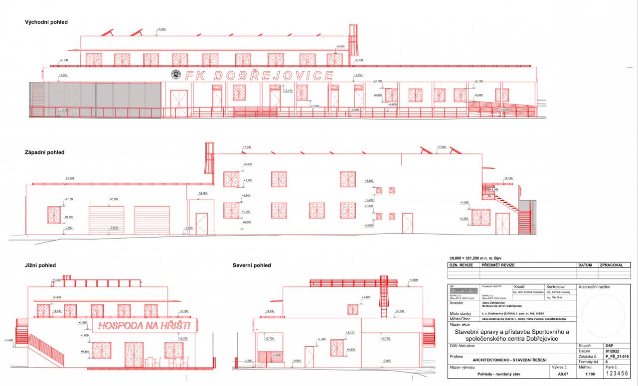 Projekt s názvem Projektová dokumentace "Stavební úpravy a přístavba Sportovního aspolečenského centra Dobřejovice" byl podpořen částkou 200 000 Kč za Středočeského Fondu podpory včasné přípravy projektů EU 2021+ a NIP.