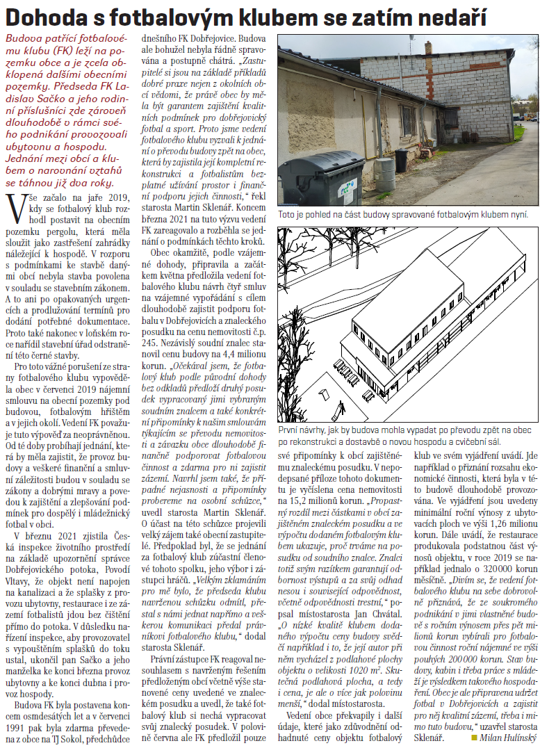 Projekt s názvem Projektová dokumentace "Stavební úpravy a přístavba Sportovního aspolečenského centra Dobřejovice" byl podpořen částkou 200 000 Kč za Středočeského Fondu podpory včasné přípravy projektů EU 2021+ a NIP.