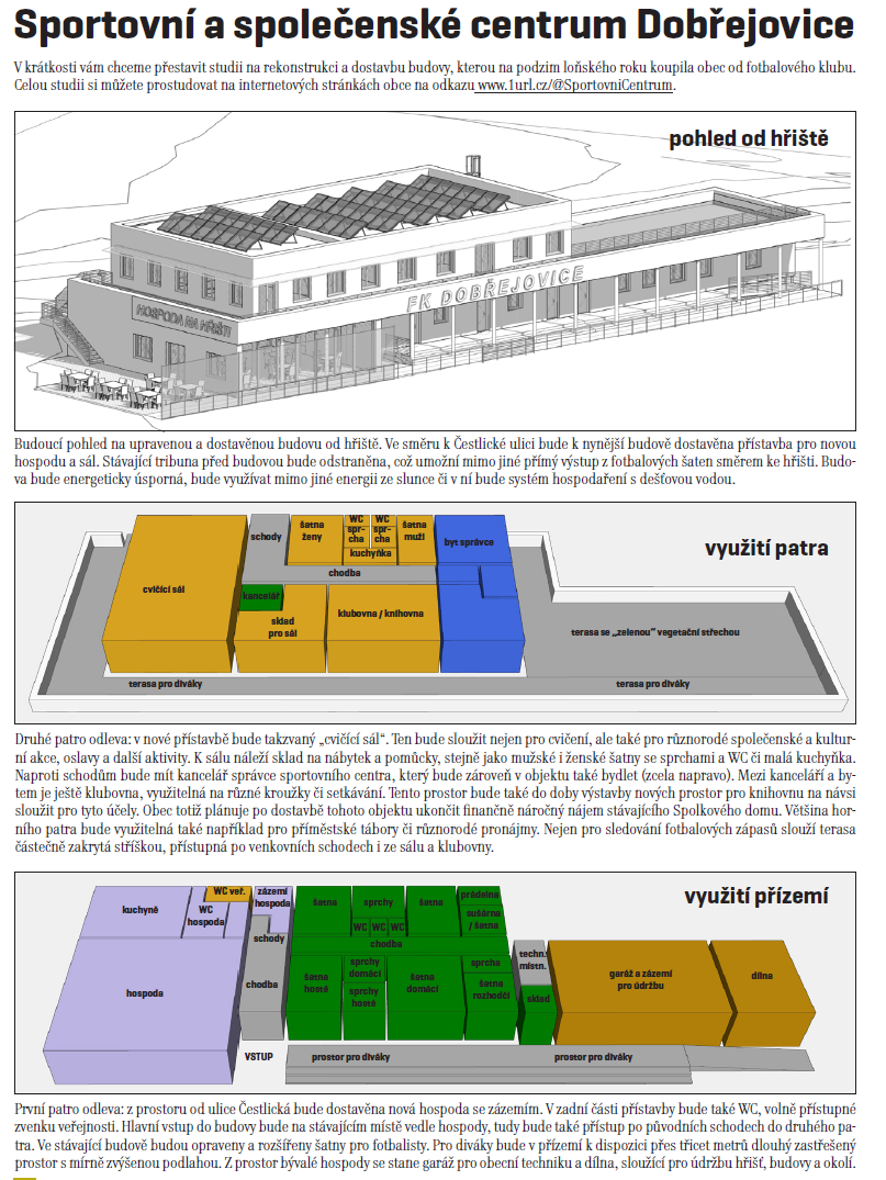 Cílem projektu je rekonstrukce budovy u dobřejovického fotbalového hřiště a dostavba nové části s hospodou, cvičícím sálem a prostory pro další aktivity. Stavba je energeticky úsporná a využívá obnovitelné zdroje energie.