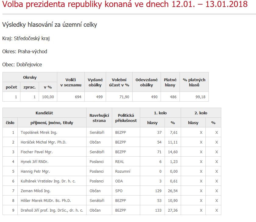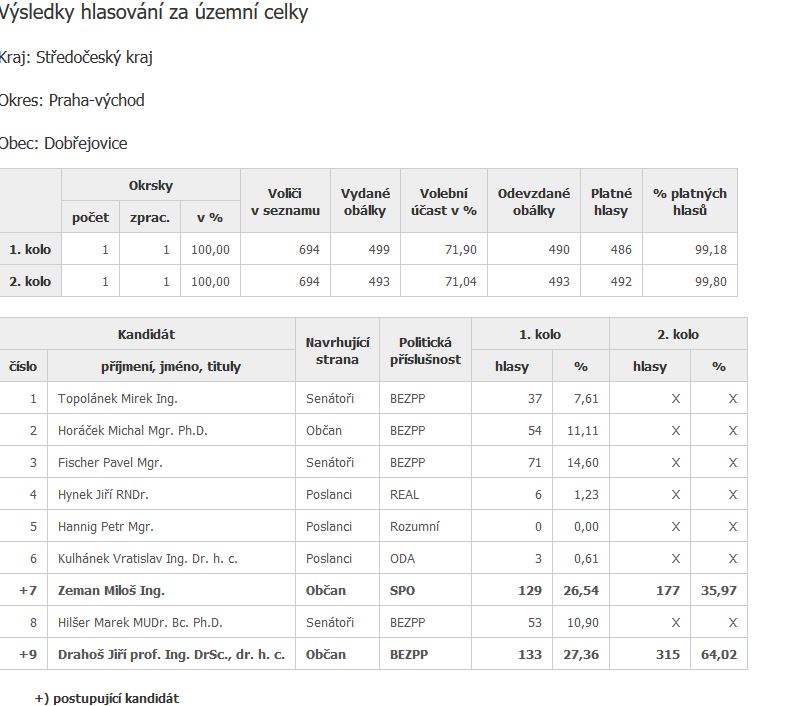 VÝSLEDKY z volby prezidenta republiky II. kola 2018 v Dobřejovicích