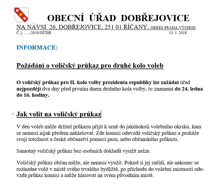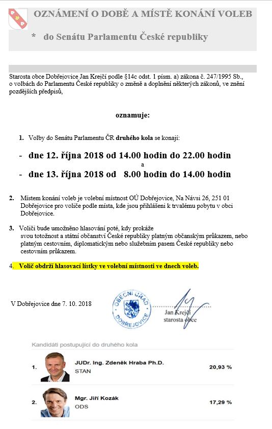 Oznámení o době a konání voleb do Zastupitelstva obce Dobřejovice a do Senátu Parlamentu ČR