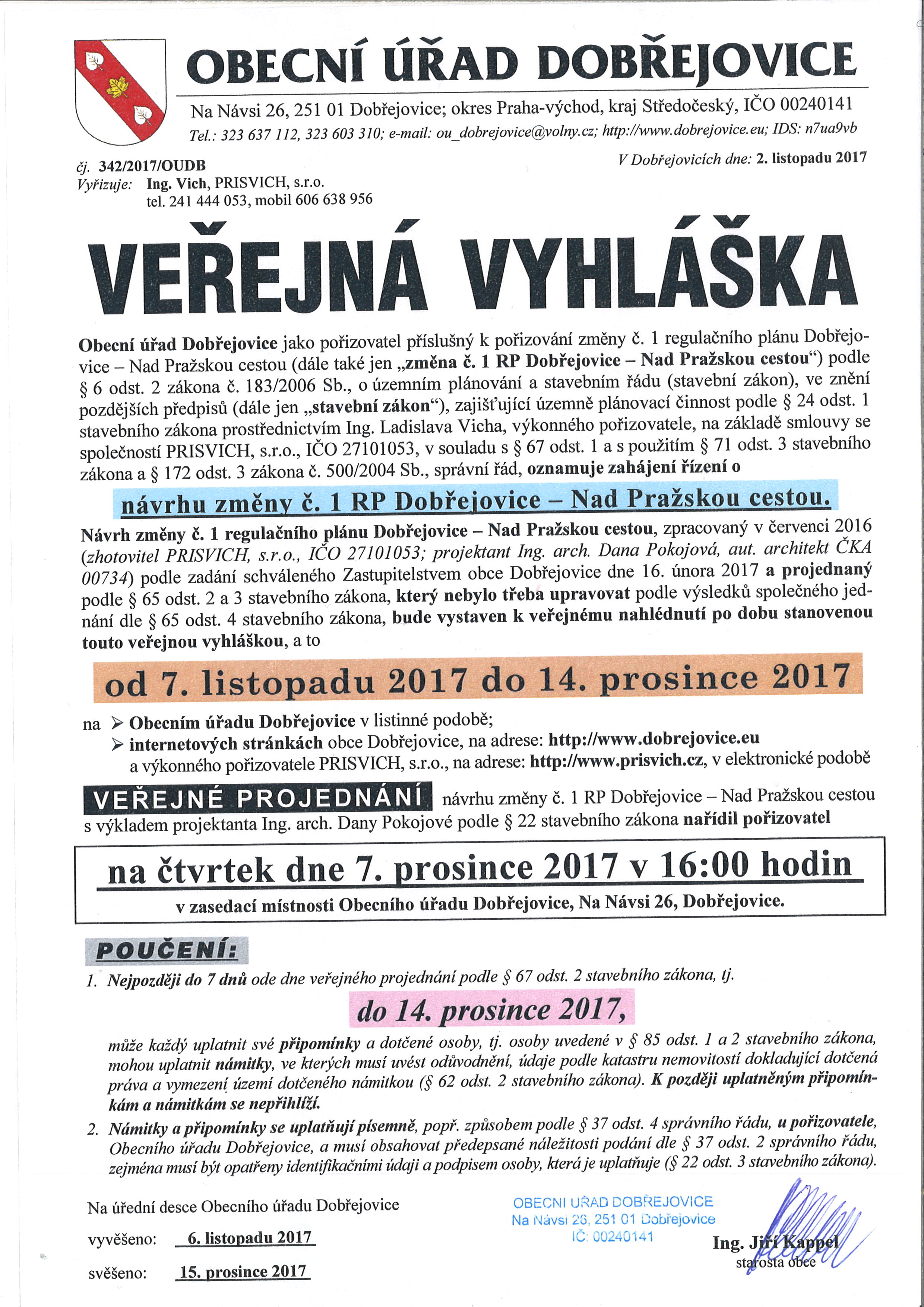 OOP č. 183/2017, Černošice - Oznámení veřejnou vyhláškou